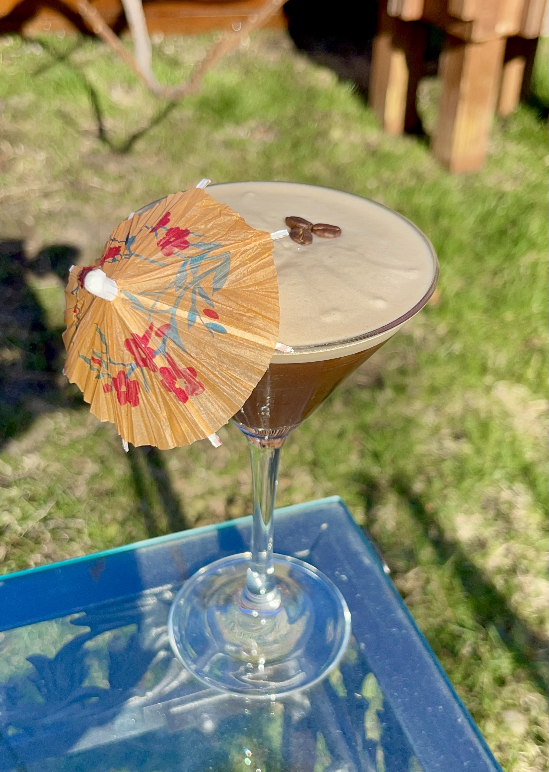 Combine all ingredients in a shaker with ice. Shake and strain into martini glass. Garnish with espresso beans and umbrella.